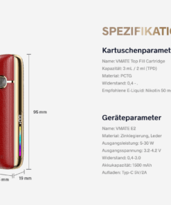 Jedoch kannst Du über einen Schieberegler auch ganz individuell den Zugwiderstand einstellen und steuern und ganz auf Deine Vorlieben und Wünsche hin anpassen. Perfekt ergänzt wird der Vmate E Akku vom brandneuen Vmate V2 Pod mit wahlweise 1,2 Ohm oder 0,7 Ohm Mesh Coil, mit denen vom klassischen MTL- bis hin zum restriktiven DL-Dampfen alles möglich ist (Mouth to Lung, Direct Lung). Die Vmate V2 Pods verfügen dabei über ein Füllvolumen von 3,0 ml und können bequem und kleckerfrei über ein durchdachtes Sidefilling System mit frischem Liquid befüllt werden.